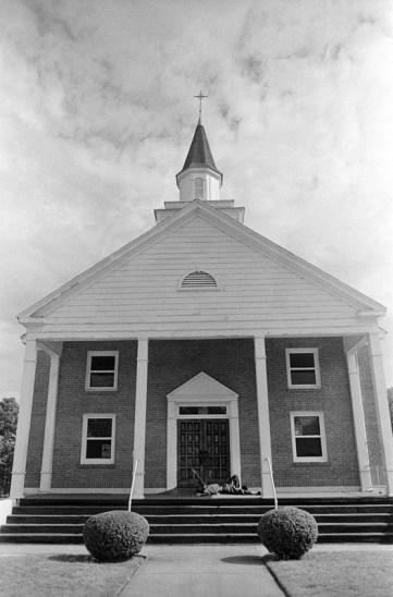 Man on Mt. Zion Baptist Church steps. 12th Street and Chicon Street