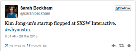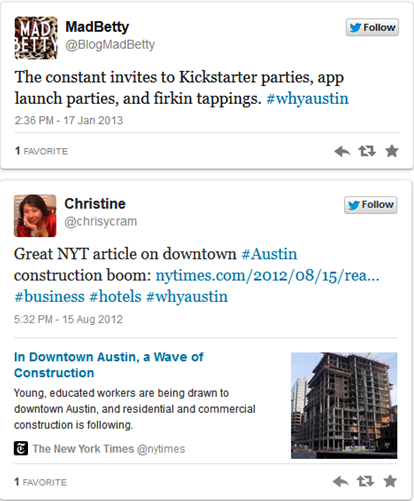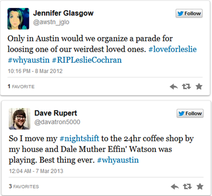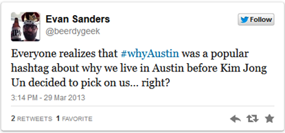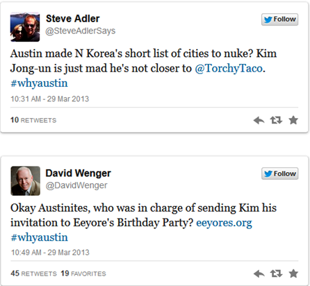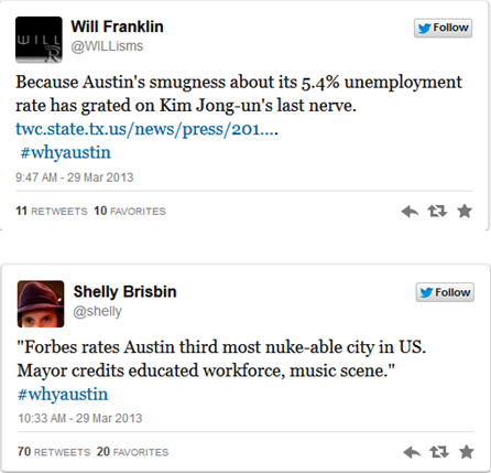 Interestingly enough, tweets featuring #WhyAustin before Kim Jong-un raised the possibility of irradiated hipsters and app developers (and regular folks too) weren’t all that different than those after. They made the same points and assumed the same boastful positions: