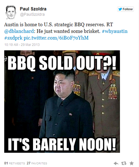 Many of the tweets featuring the hashtag ironically juxtaposed all the things that shore up Austin’s reputation with the specter of nuclear annihilation raised by Kim Jong-un, however ineptly he and his regime may have done so, ultimately implying that the dictator was jealous of the city’s “great success,” however one chose to define that “success.” In short, the hashtag provided an opportunity to boast about the city. Some took the Forbes Magazine approach, celebrating the city’s reputation as an economic powerhouse, the bastion of the creative class: