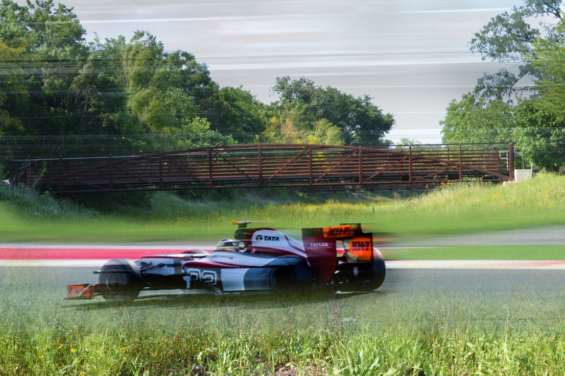 Turn 12: the low thwack of helicopters blades drop from the sky while tanagers, sparrows and other birds sing from the branches of trees and electricity poles. Formula One cars fly past every minute in constant doppler effect, mixing their low frequencies with the noise of airplane turbines. The traffic of highways is a furious river while, in brushy areas, cicadas mark their endless rhythms. In parking lots and on overgrown sidewalks further east the long grasses wave as the wind passes by—