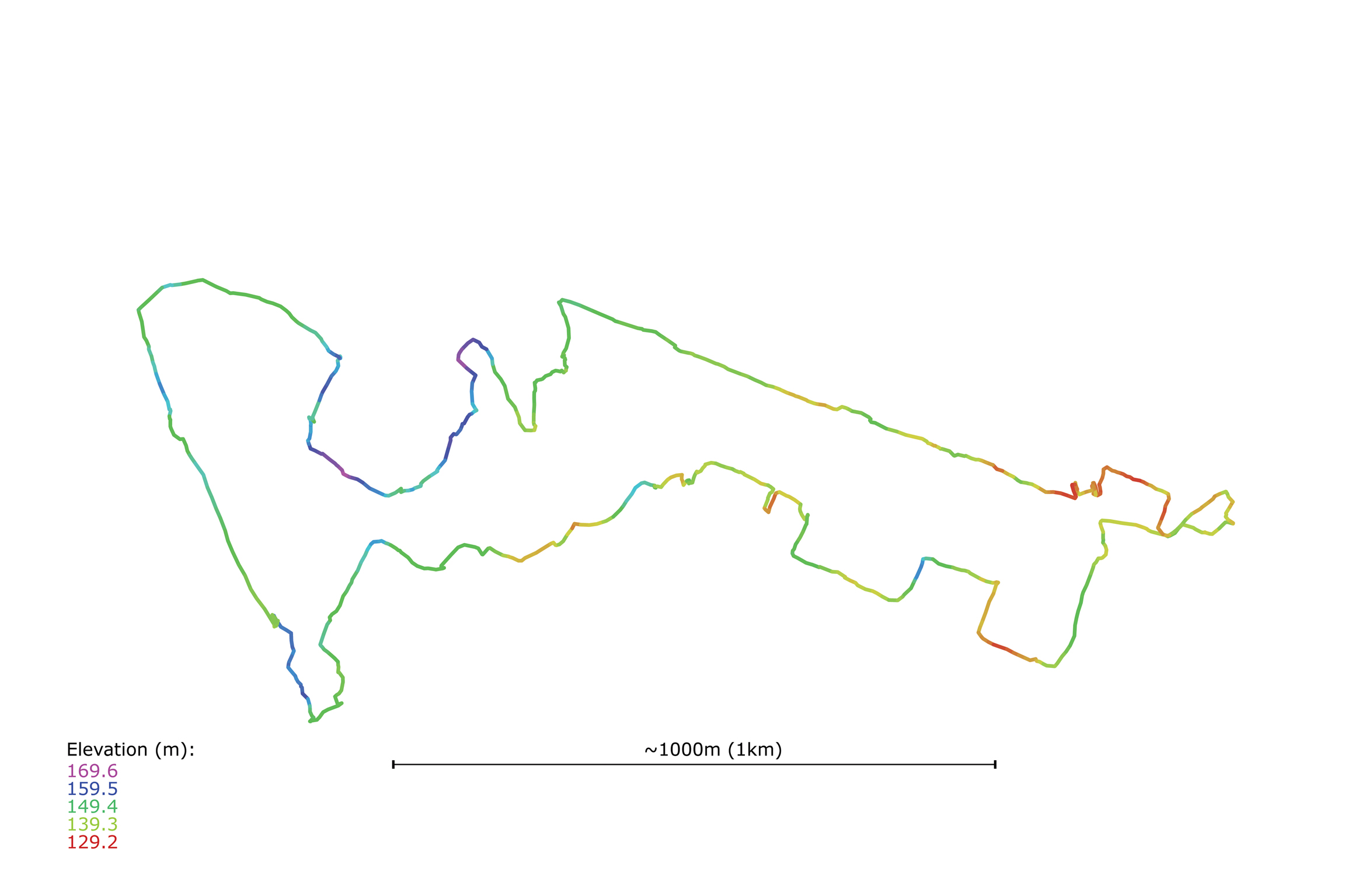 Exact GPS trace of the Pole Position walk visualized from the recorded GPS log file. Peculiaritiesof the route are explained in the body of the essay. The GPS log file provided elevational data (color coded in the visualization), adding a topographic layer of information to the chart of the walk.