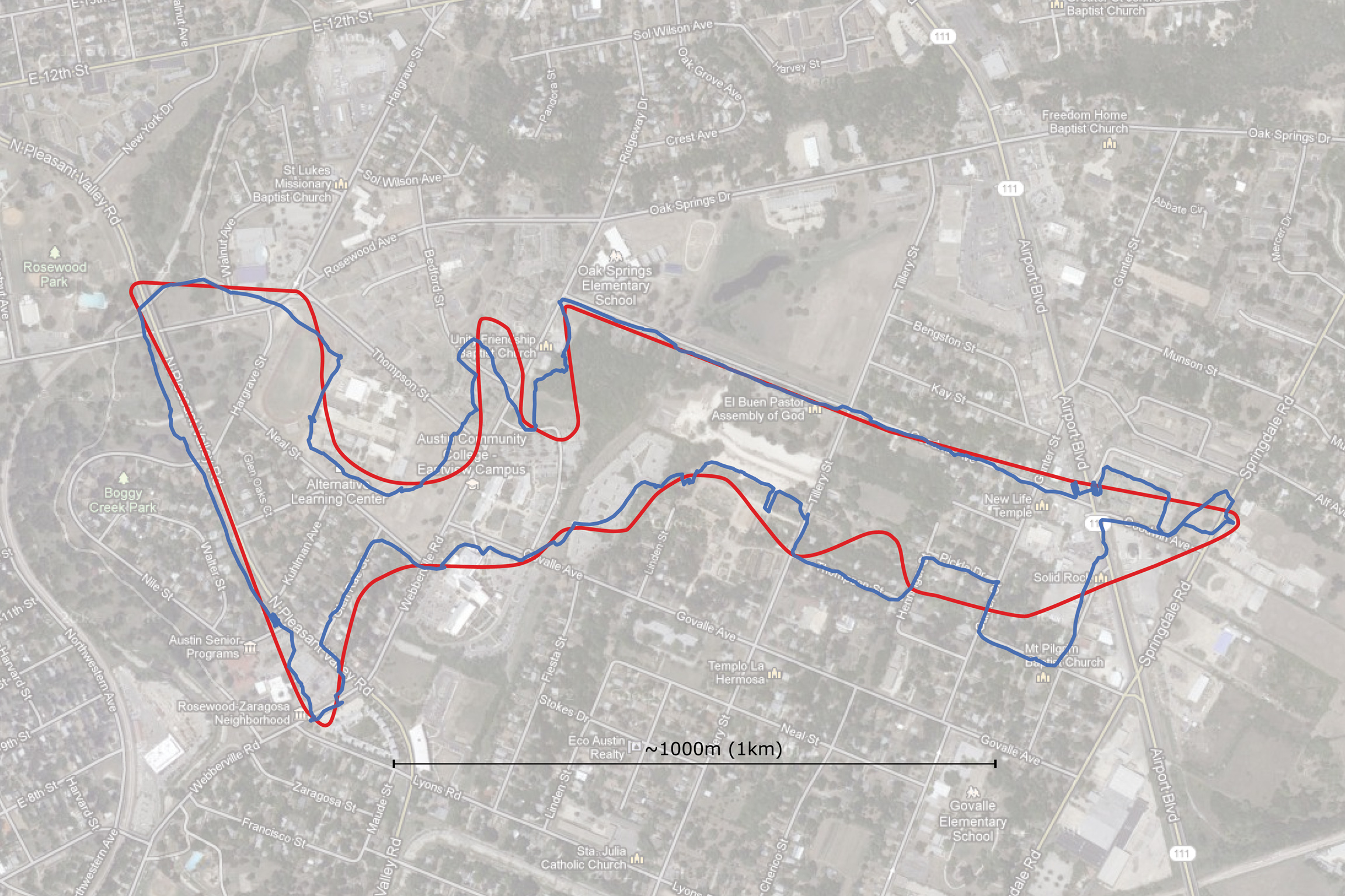 Access to digital maps and to web tools for creating GPS routes has opened not only opportunities for amateur mapping and volunteer cartography but also for experimental re-appropriation of maps, cartography and creative juxtaposition of geographic information. These technologies, particularly the web mapping resources and GPS personal navigation device, facilitated the planning, performing, and recording of our Pole Position walk.xiv For instance, accessing satellite imagery and digital maps was crucial for deciding the location of our walk and for the accurate tracing of the F1 COTA racetrack and its transposition (at a 1:1 scale) in another area of the city. To select a proper route for our dérive, the COTA track was compared with the irregular street grid of East Austin. Rotated slightly, the triangular shape of the track aligned with the axes established by Goodwin Avenue, where the regular street grid of downtown is seen, and Pleasant Valley Road, around which the creek has created irregular streets that cross the railroad tracks as they run north along the waterway. A graphic overlay was created for the purpose of navigation.