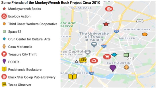From 2009-2010, we both volunteered at MonkeyWrench Books in Austin, Texas, and this essay critically reflects on our experience with this collective project. We use the term “MonkeyWrench Project” (MWP) to refer to the bookstore and the radical community that it supported. As we go on to discuss, the bookstore has always been more than a bookseller. The store is financed by a mixture of selling books and collecting donations and staffed entirely by volunteers; an organizing collective runs the MWP on an anarchist model of radical consensus, which became more well-known during the Occupy Movement. While book-selling finances the project and is its publicly commercial goal, MWP’s overarching political purpose is to create an enduring space for radical thought and action in Austin. While an average afternoon might find a few people browsing the shelves, the store also hosts film screenings, music events, book readings, artistic events, and public talks a few times a week. Part of a larger national and international network of infoshops and workers’ collectives, MonkeyWrench has become not only a fixture of Austin’s radical community, but a place for touring authors, film directors, and musicians to present and perform. MWP provides important infrastructure for a wider network of anarchist and radical movements as well.