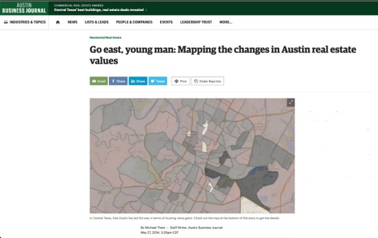 Although the trope of colonialism figures strongly in recent representations of gentrification in Austin, a connection between these two has recently been observed in other cities (Safransky 2014). In Austin newspapers one reads about East Austin’s creative pioneers; there was even an article on real estate in the Austin Business Journal, boldly titled “Go East, Young Man,” describing how Austin’s best real estate deals can now be found in East Austin. In these articles, there are echoes of what Smith (1996: 11) suggested more than 20 years ago: